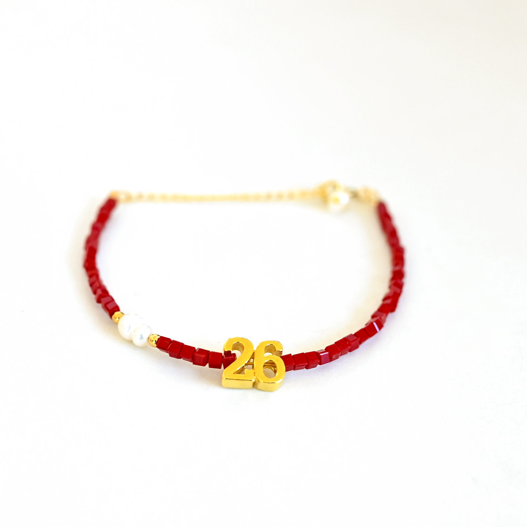 Το βραχιόλι αποτελείται από μια σειρά μικρά κόκκινα κρύσταλλα SWA σε τετράγωνη κοπή που προσφέρουν ιδιαίτερη υφή. Στο κέντρο δεσπόζει το ασημένιο στοιχείο με τη χρονολογία “26”, συμβολίζοντας τη νέα αρχή. Η σχεδιαστική λεπτομέρεια που κάνει τη διαφορά είναι το μαργαριτάρι που πλαισιώνει τον αριθμό, προσθέτοντας μια νότα διαχρονικής πολυτέλειας και “σπάζοντας” την μονοτονία του μαύρου.